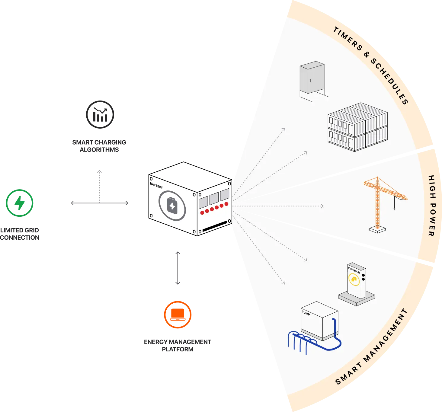 Met een standaard mini-container van minder dan 4 m² grondoppervlak voeden we de gehele bouwsite met stroom uit een zeer beperkte netaansluiting.